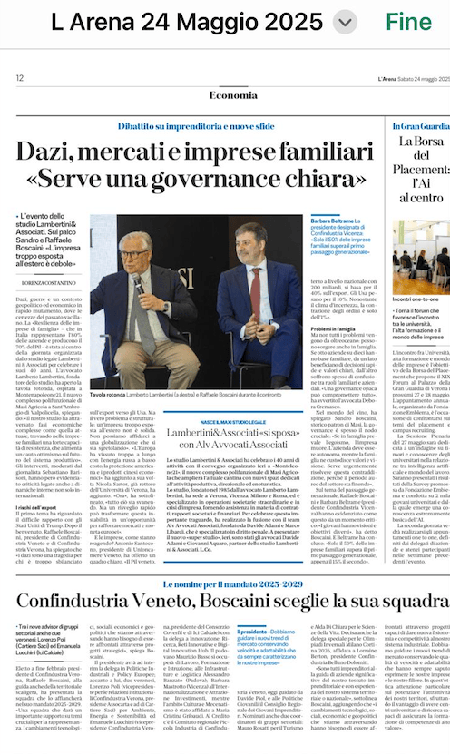 In occasione di questo anniversario, lo Studio ha promosso un importante dibattito pubblico – riportato anche da L’Arena – sul tema: “Dazi, mercati e imprese familiari: serve una governance chiara”. Un confronto ricco di spunti che ha visto protagonisti diverse personalità del tessuto economico veneto tra i quali Raffaele Boscaini, presidente di Confindustria Veneto.